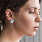 Rankų darbo modernūs veriamieji auskarai. Itin lengvi. Matmenys: apie 1,5 x 1,5 cm.