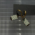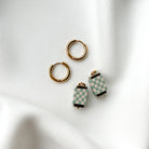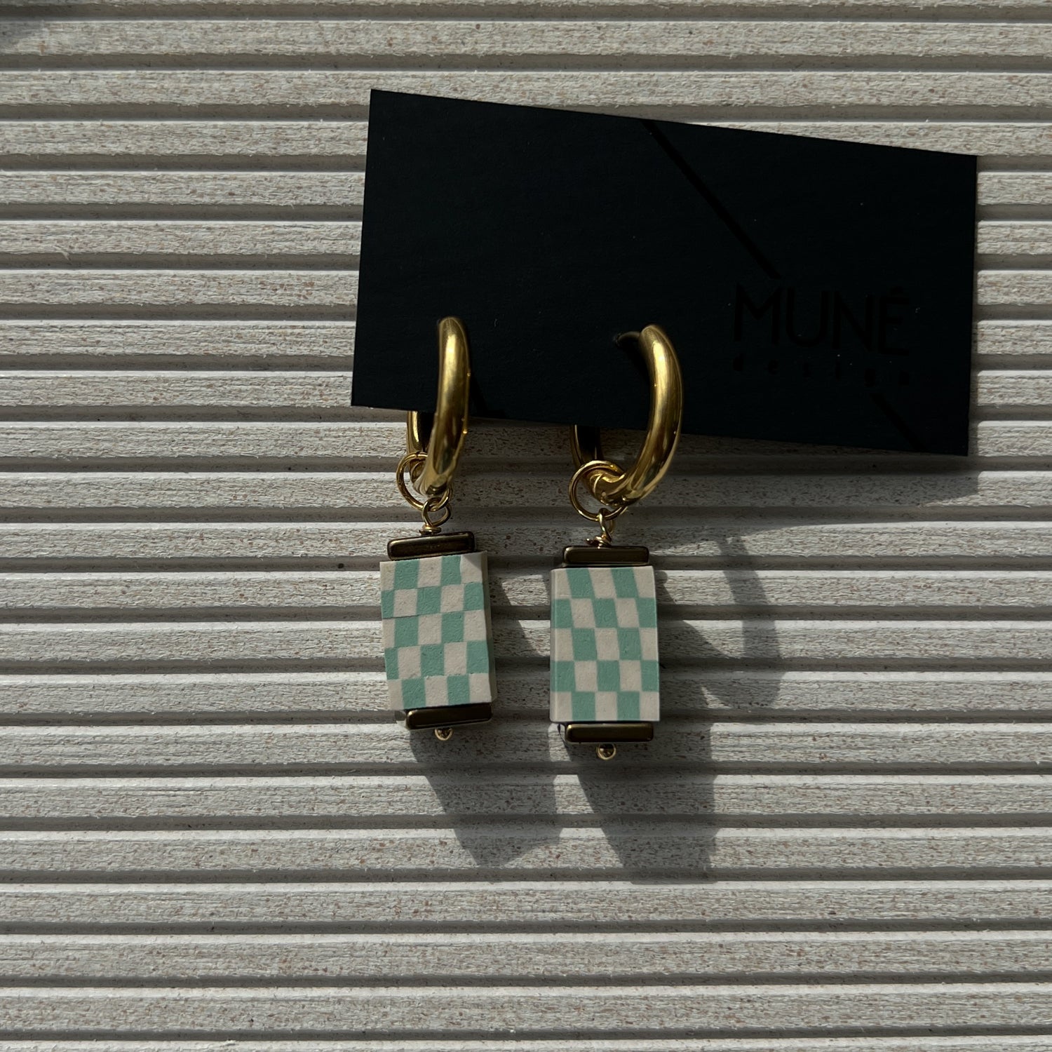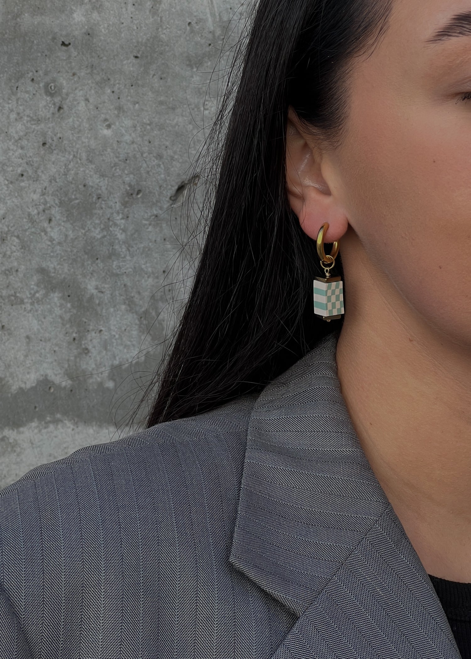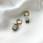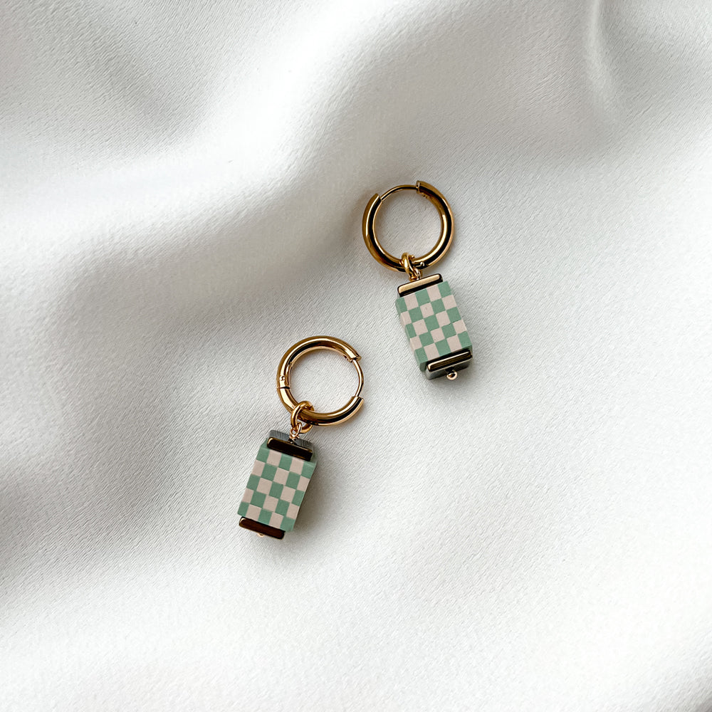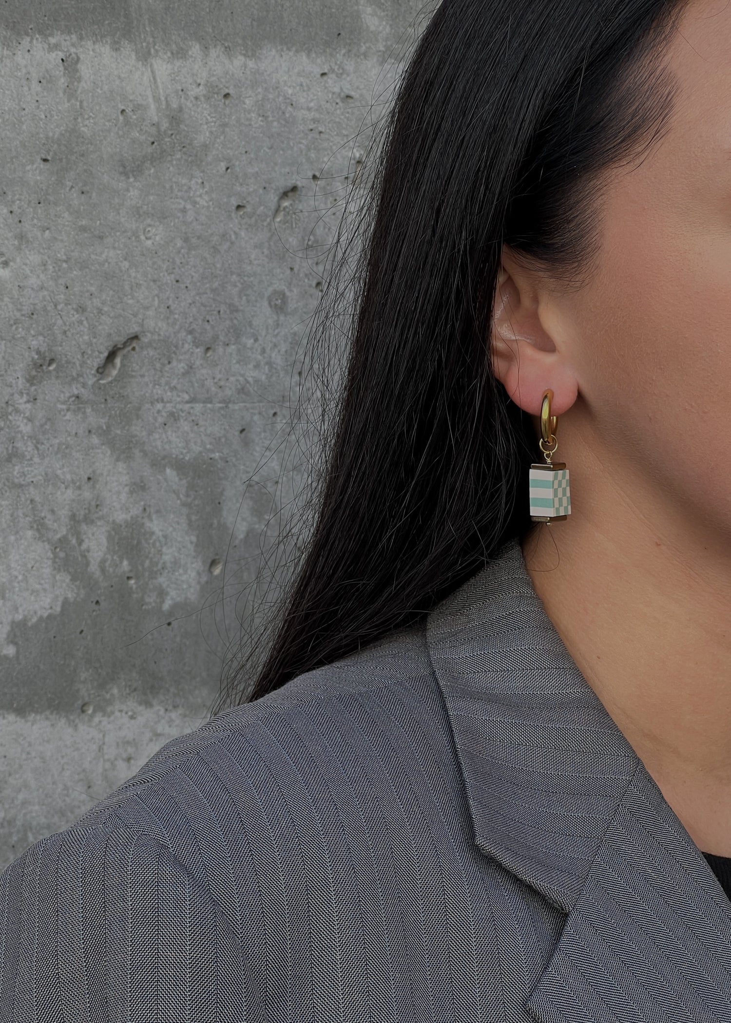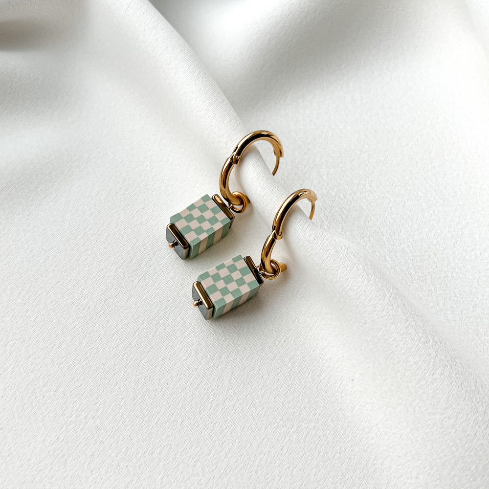 Auksu padengti auskarai-rinkutės su rankų darbo polimerinio molio pakabuku. Pakabuką galima nuimti. Itin lengvi. Rinkutės skersmuo – 1,6 cm, ilgis – 3,7 cm.
