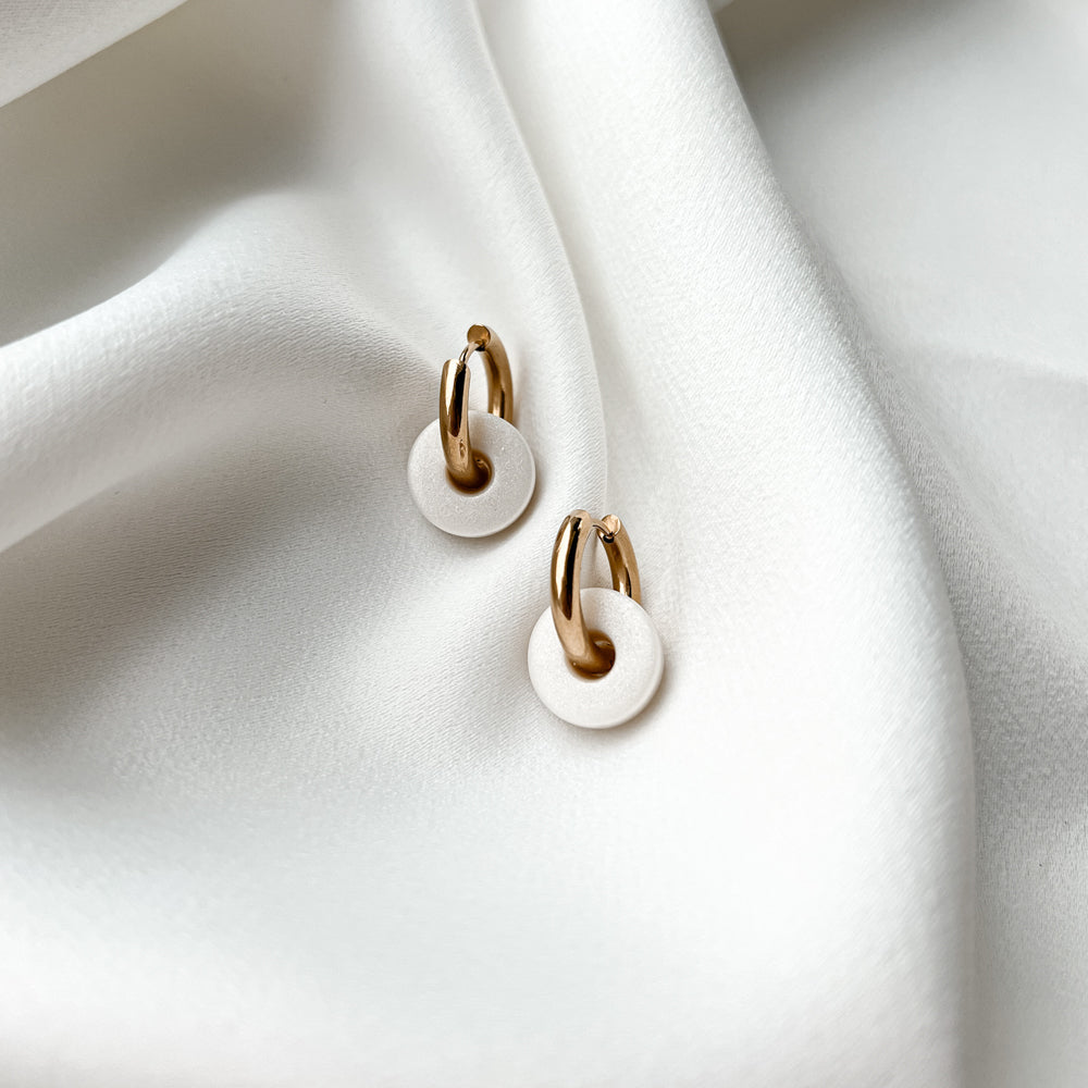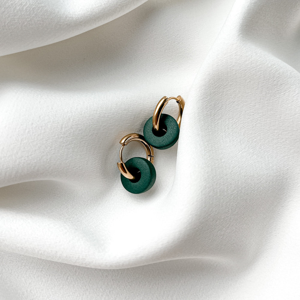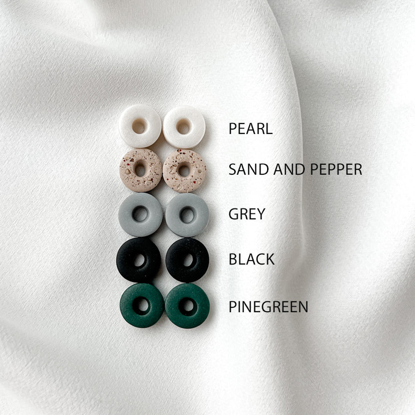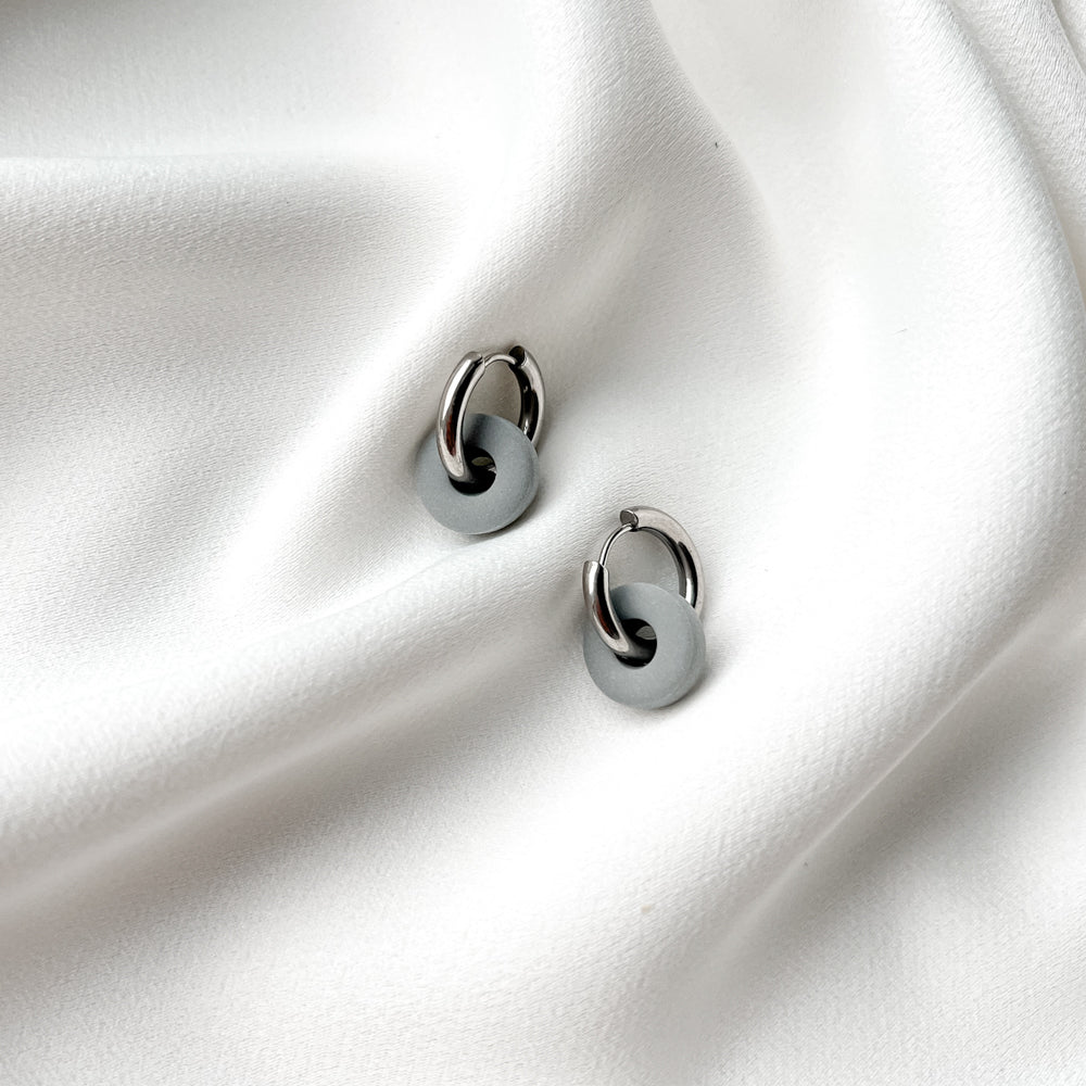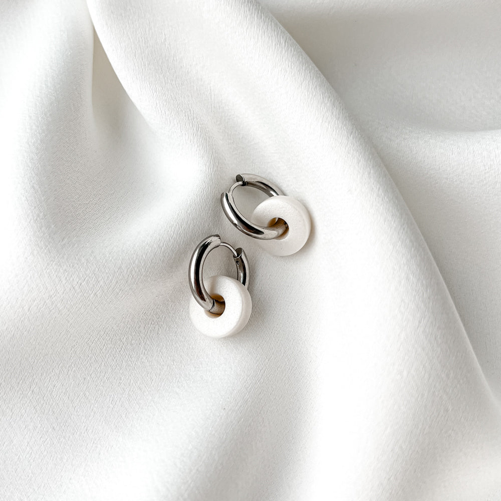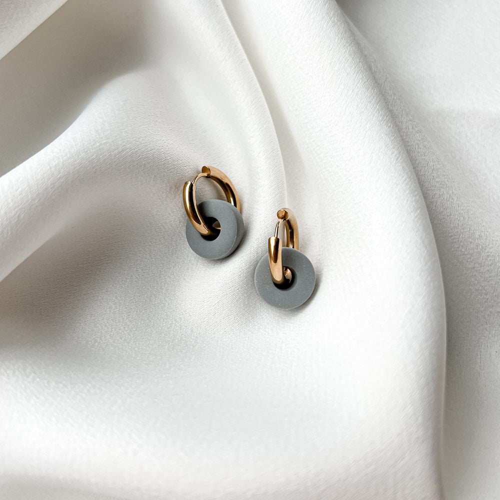 Nerūdijančio plieno arba paauksuoti auskarai-rinkutės su rankų darbo polimerinio molio pakabuku. Pakabuką galima nuimti. Itin lengvi. Rinkutės skersmuo – 1,7 cm, ilgis – 2,4 cm.