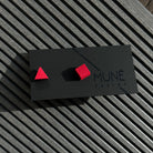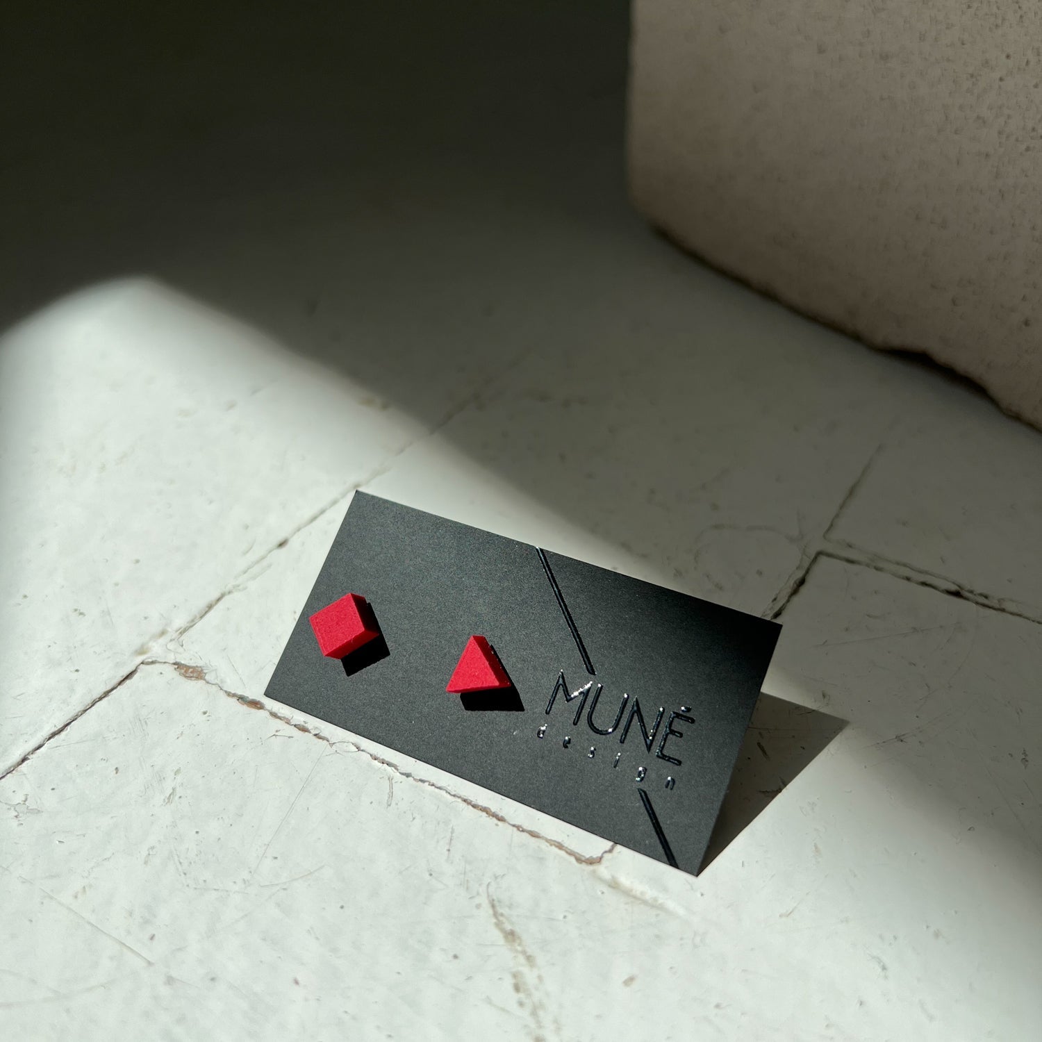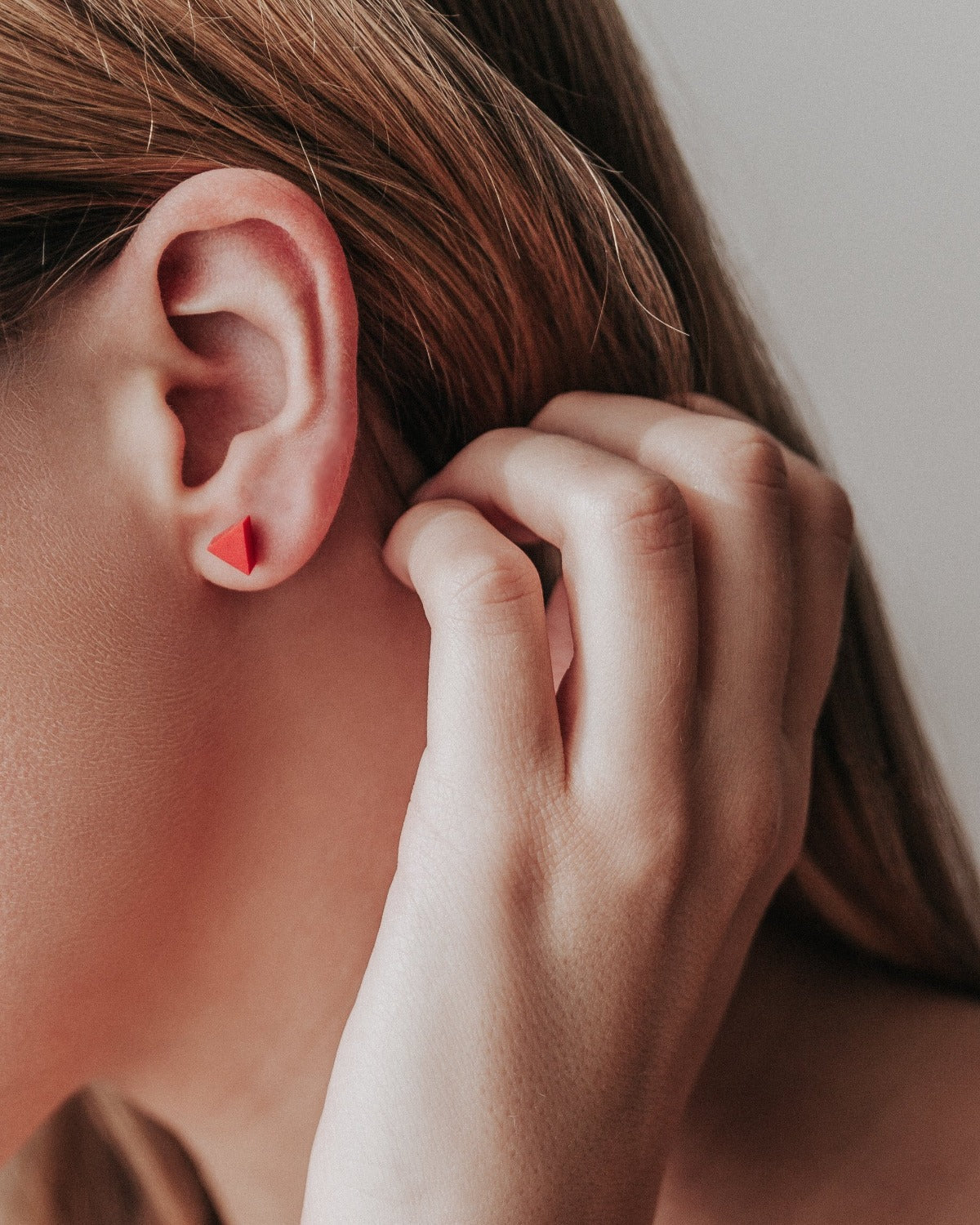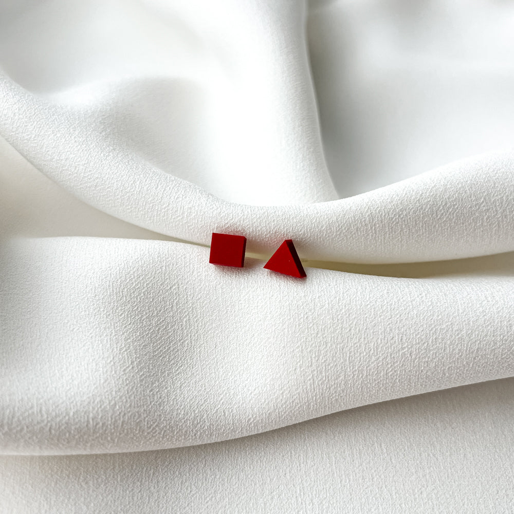 Maži geometriniai rankų darbo auskarai. Itin lengvi. Skersmuo – apie 5-6 mm.