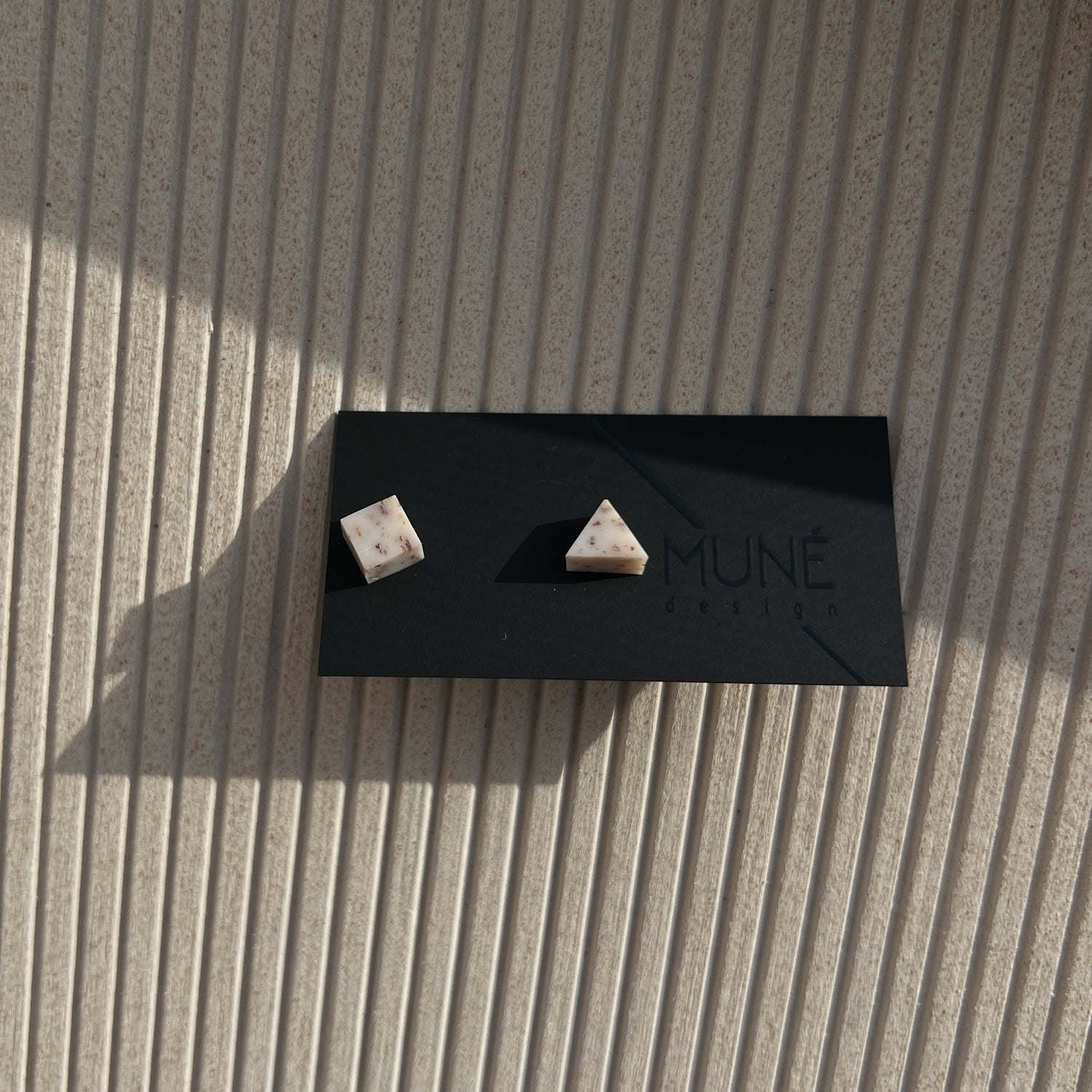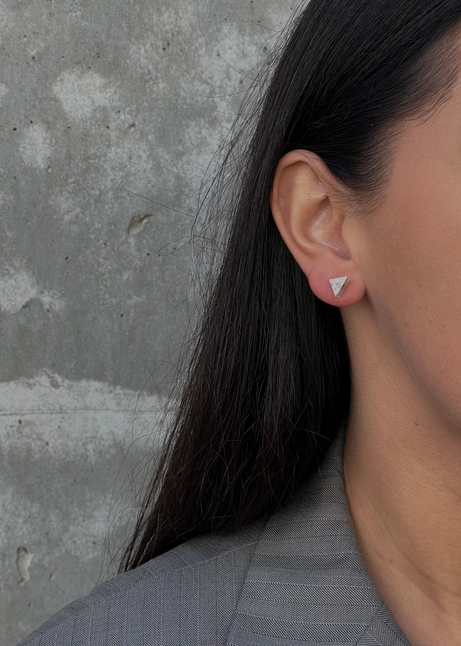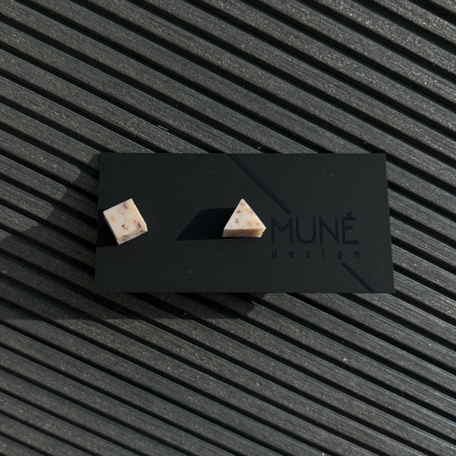 Maži geometriniai rankų darbo veriamieji auskarai. Itin lengvi. Medžiagos: polimerinis molis, nealergizuojantys, aukštos kokybės įvėrimai be nikelio. Skersmuo – apie 5–6 mm.