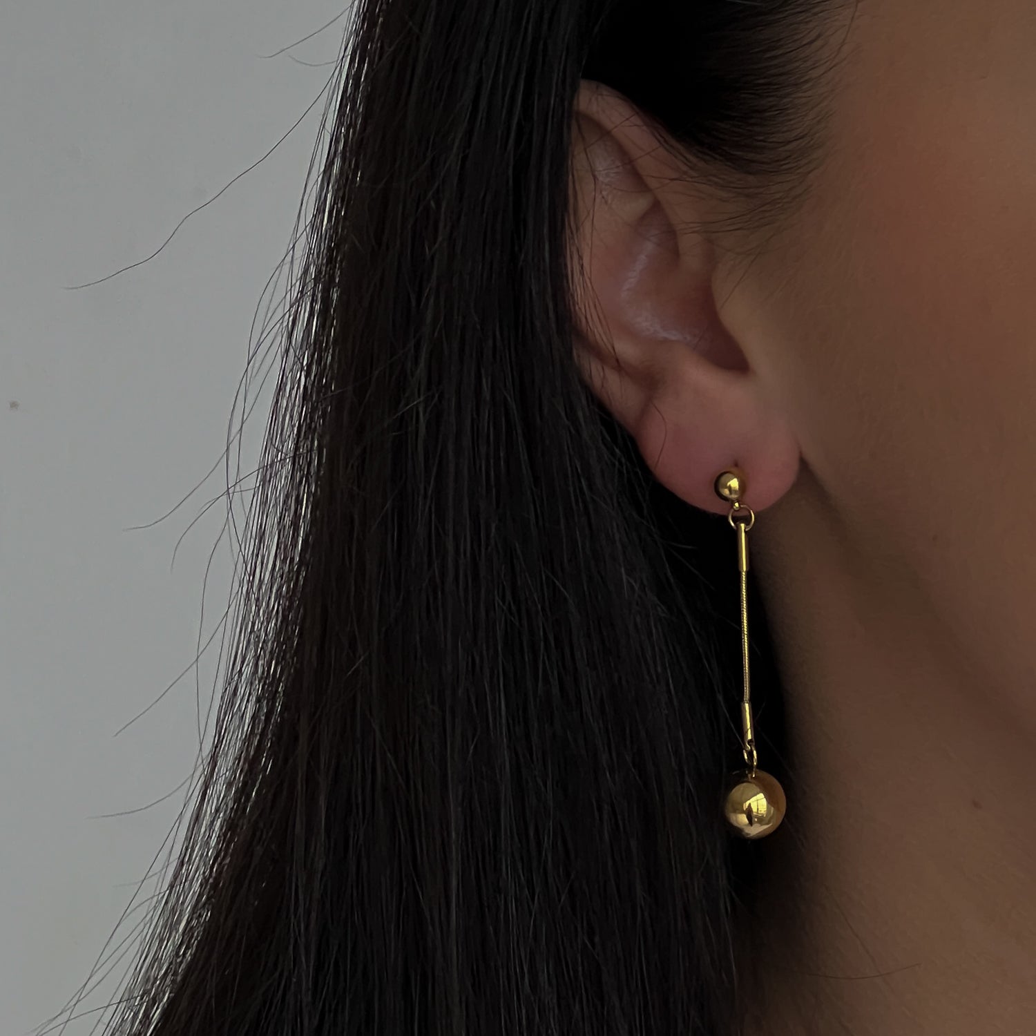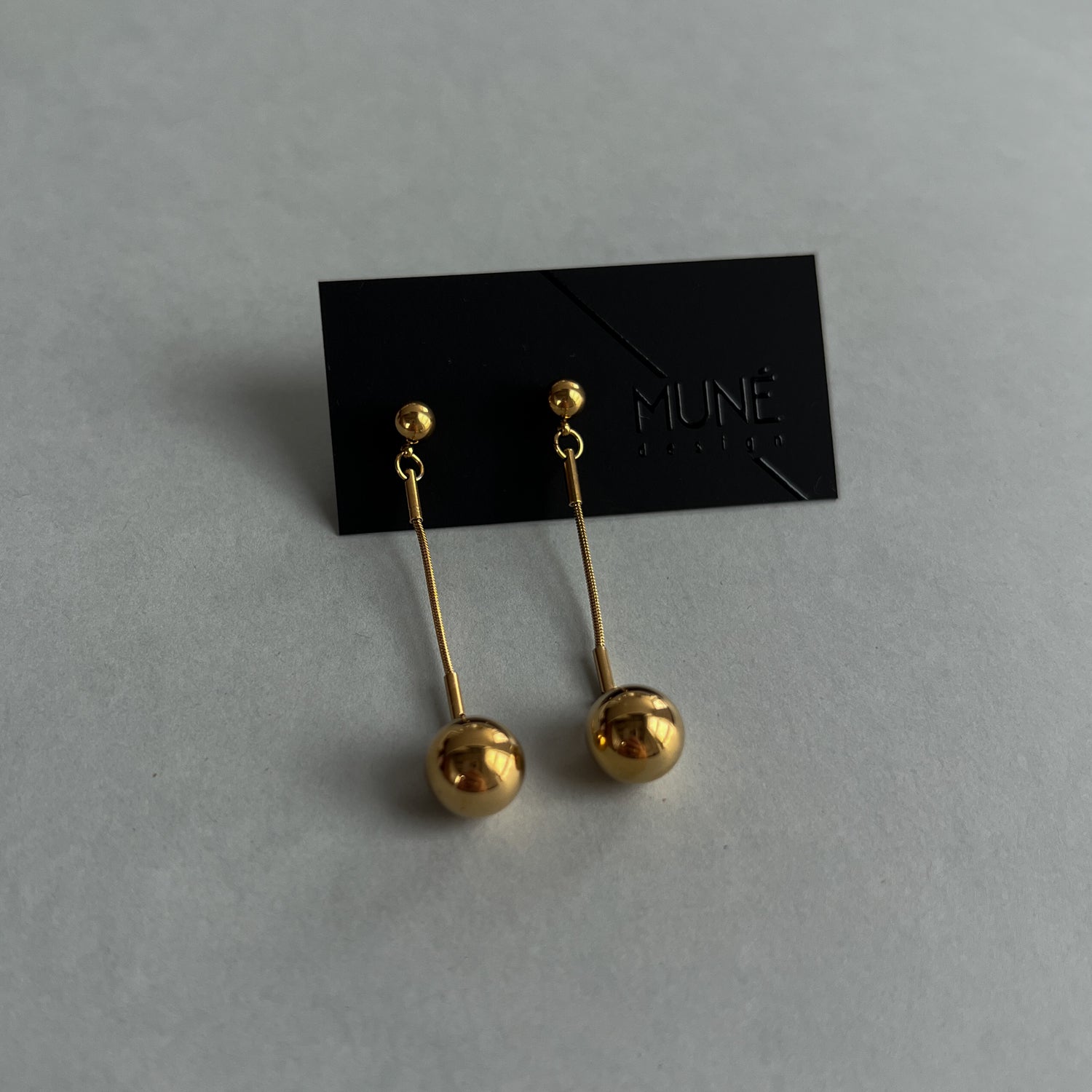 Auksinės spalvos kabantys auskarai su burbuliuku. Pagaminta iš nerūdijančio plieno, padengta 1,5 mikrono PVD auksu, o tai reiškia, kad paauksavimas išlieka ilgiau bei yra atsparus vandeniui.