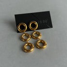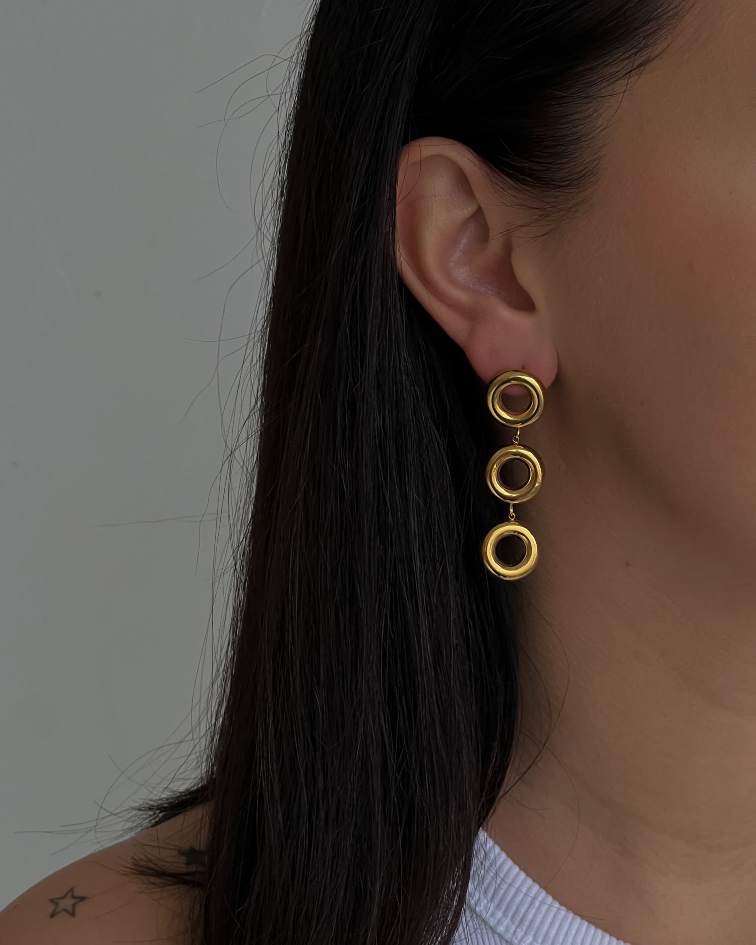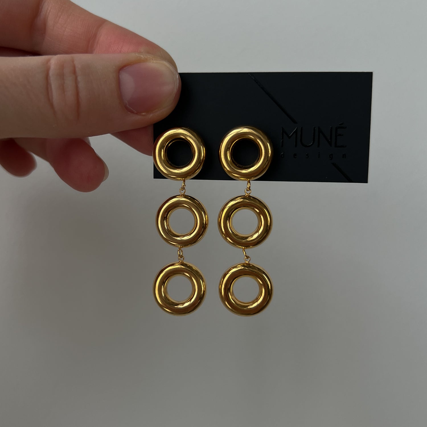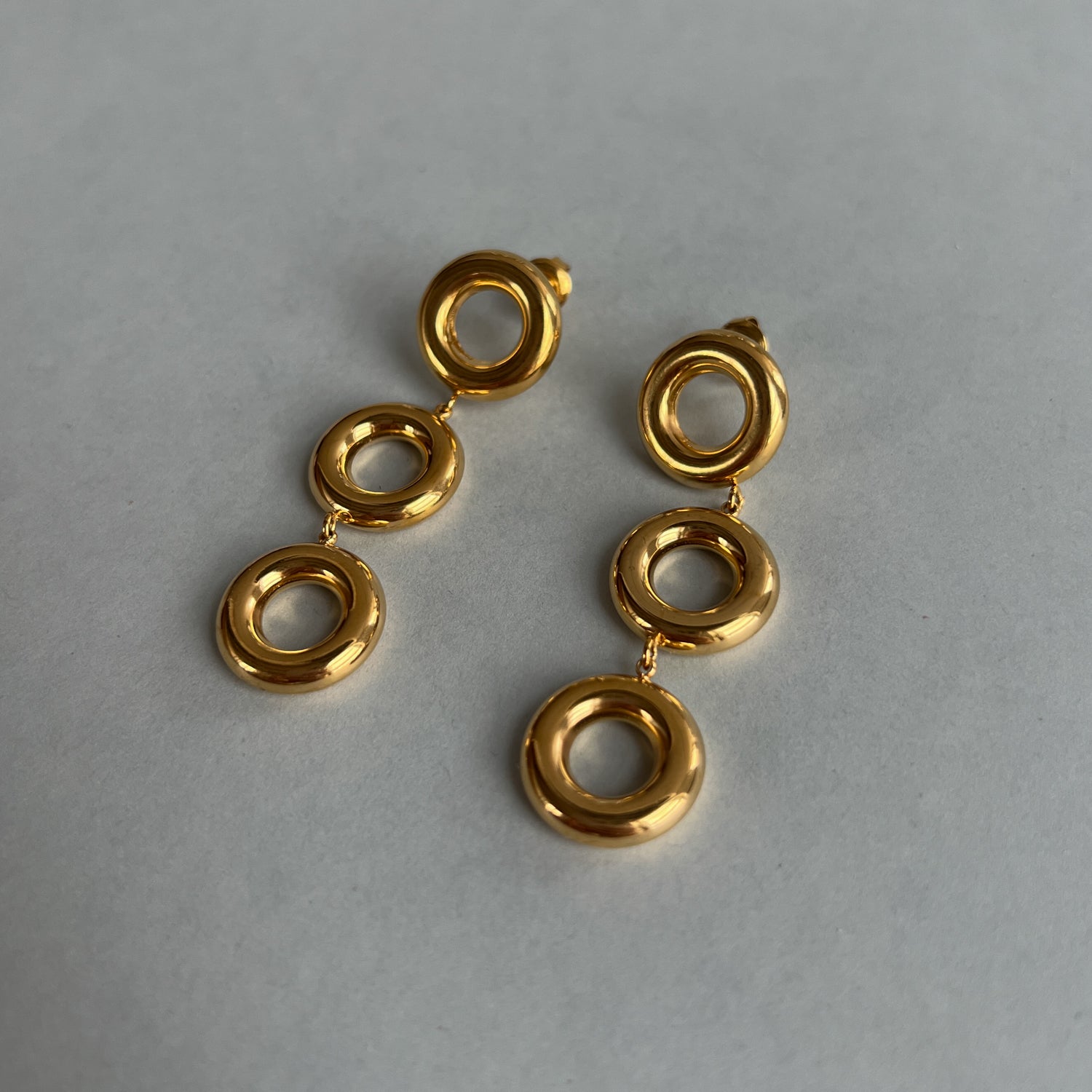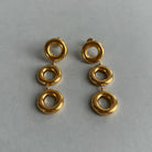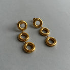 Auksinės spalvos kabantys auskarai. Sunkūs. Pagaminta iš nerūdijančio plieno, padengta 1,5 mikrono PVD auksu, o tai reiškia, kad paauksavimas išlieka ilgiau bei yra atsparus vandeniui.