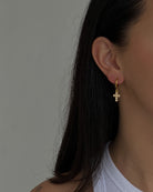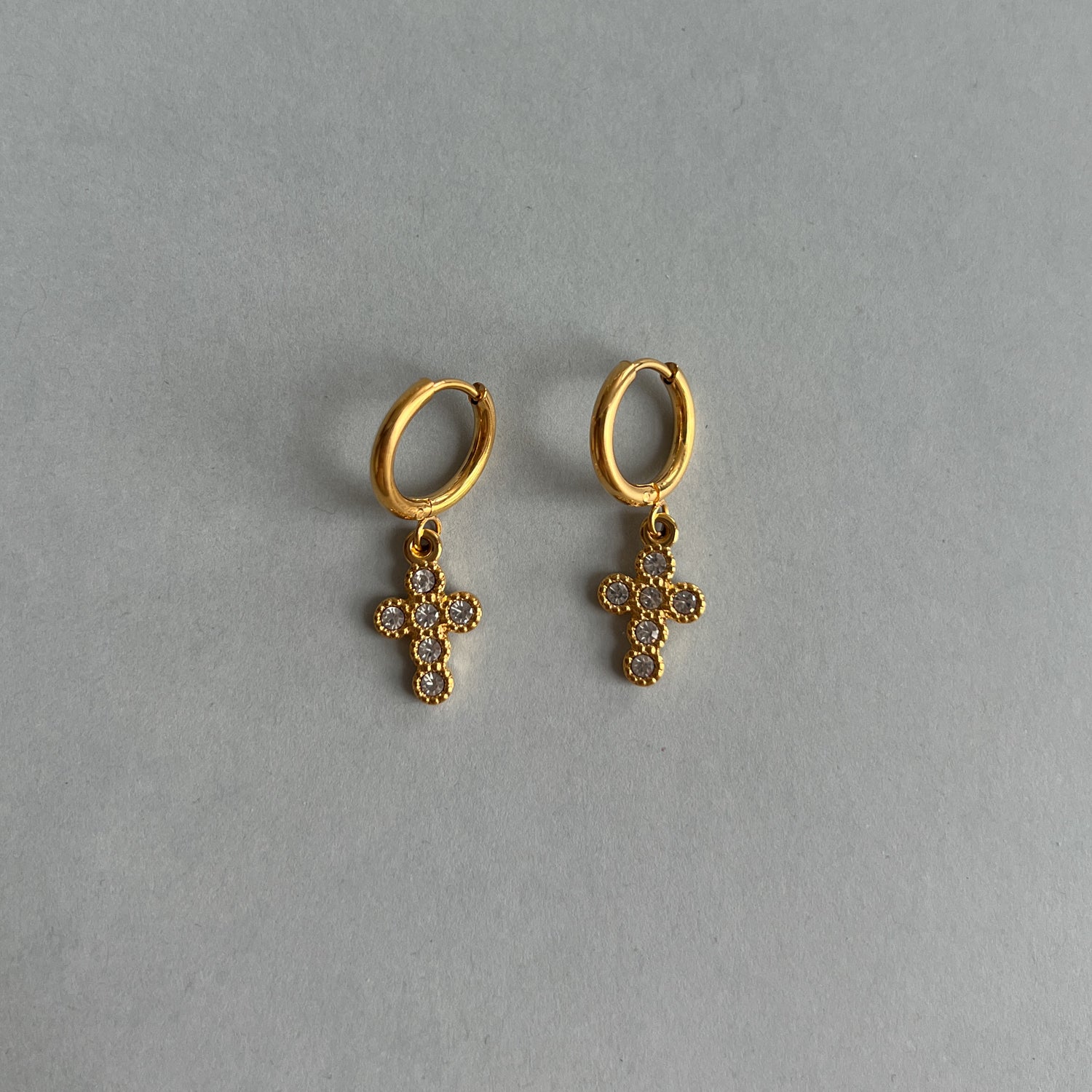 Auksinės spalvos auskarai-rinkutės su cirkonio kryželio formos pakabuku. Pagaminta iš nerūdijančio plieno, padengta 1,5 mikrono PVD auksu, o tai reiškia, kad paauksavimas išlieka ilgiau bei yra atsparus vandeniui.