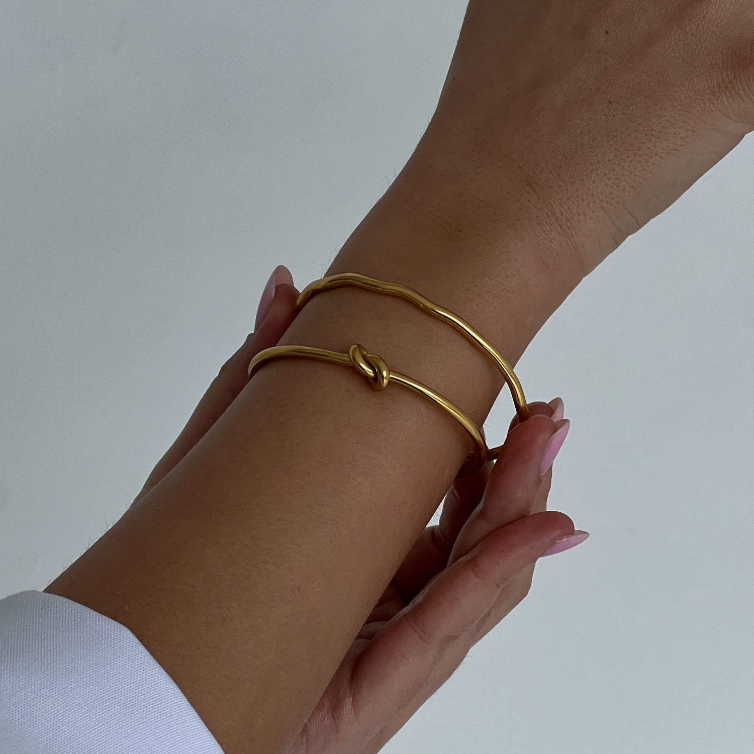 Minimalistinė atvira apyrankė. Pagaminta iš nerūdijančio plieno, padengta 1,5 mikrono PVD auksu, o tai reiškia, kad paauksavimas išlieka ilgiau bei yra atsparus vandeniui.