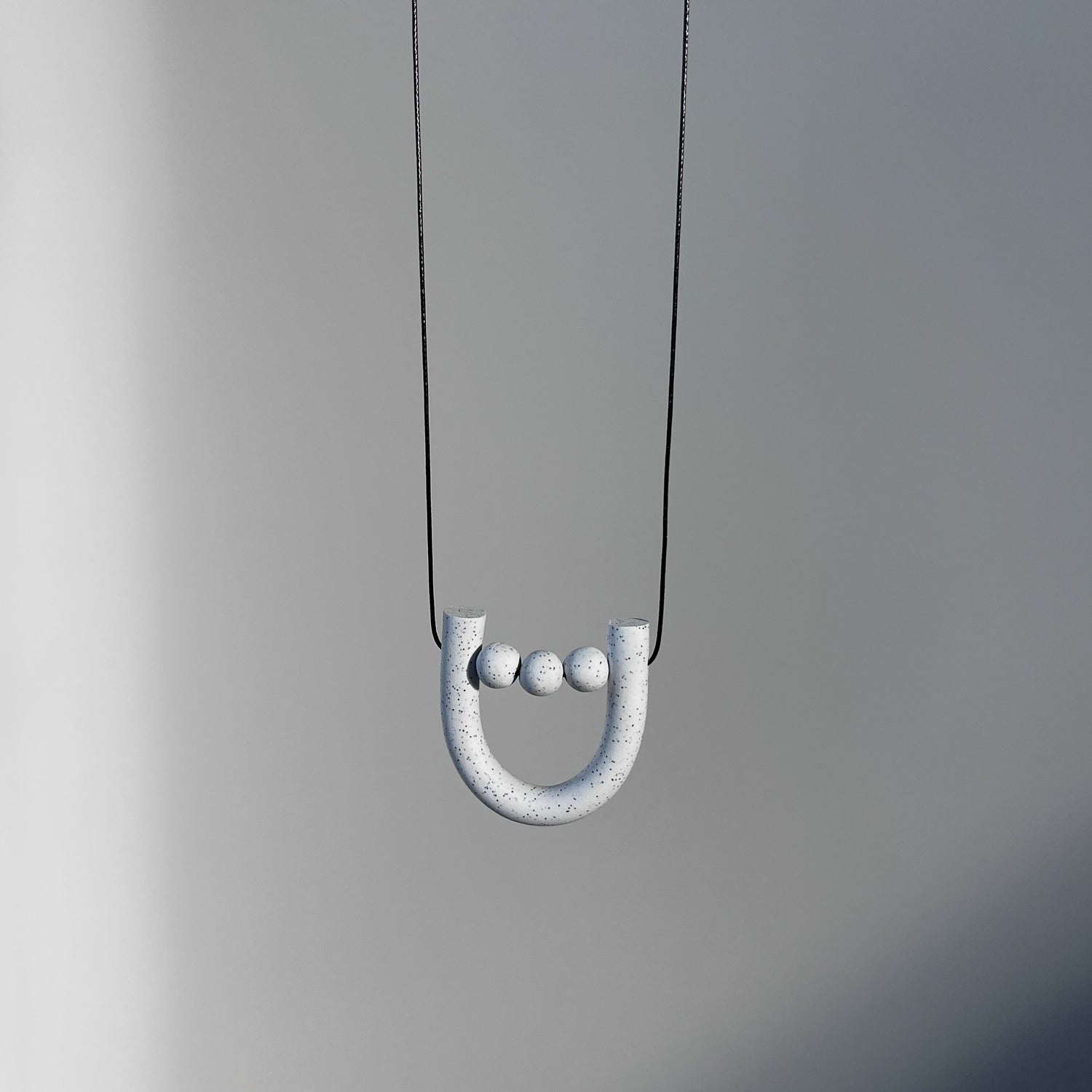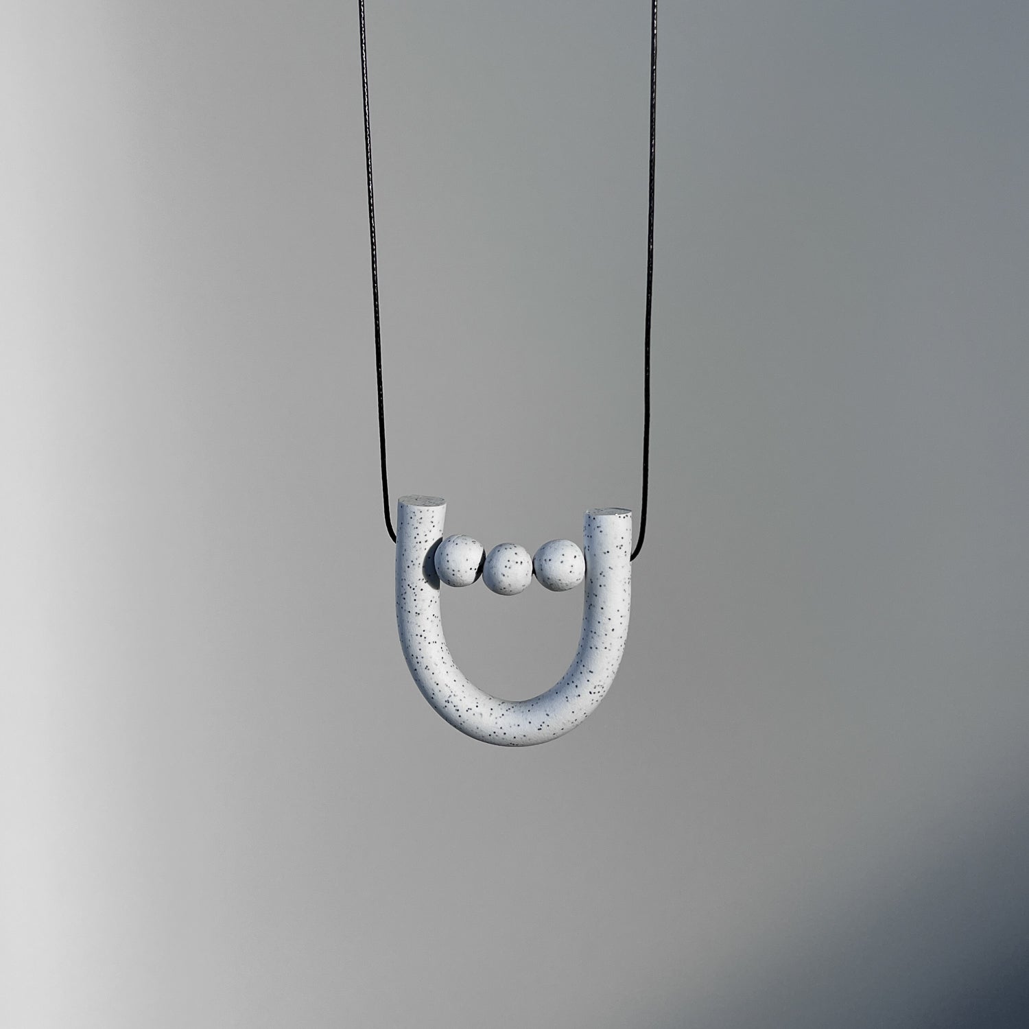 Modernus rankų darbo vėrinys. Medžiagos: polimerinis molis, hematitas, vaškuota akrilinė virvelė. Virvelės ilgis – apie 90 cm, reguliuojamas.