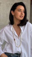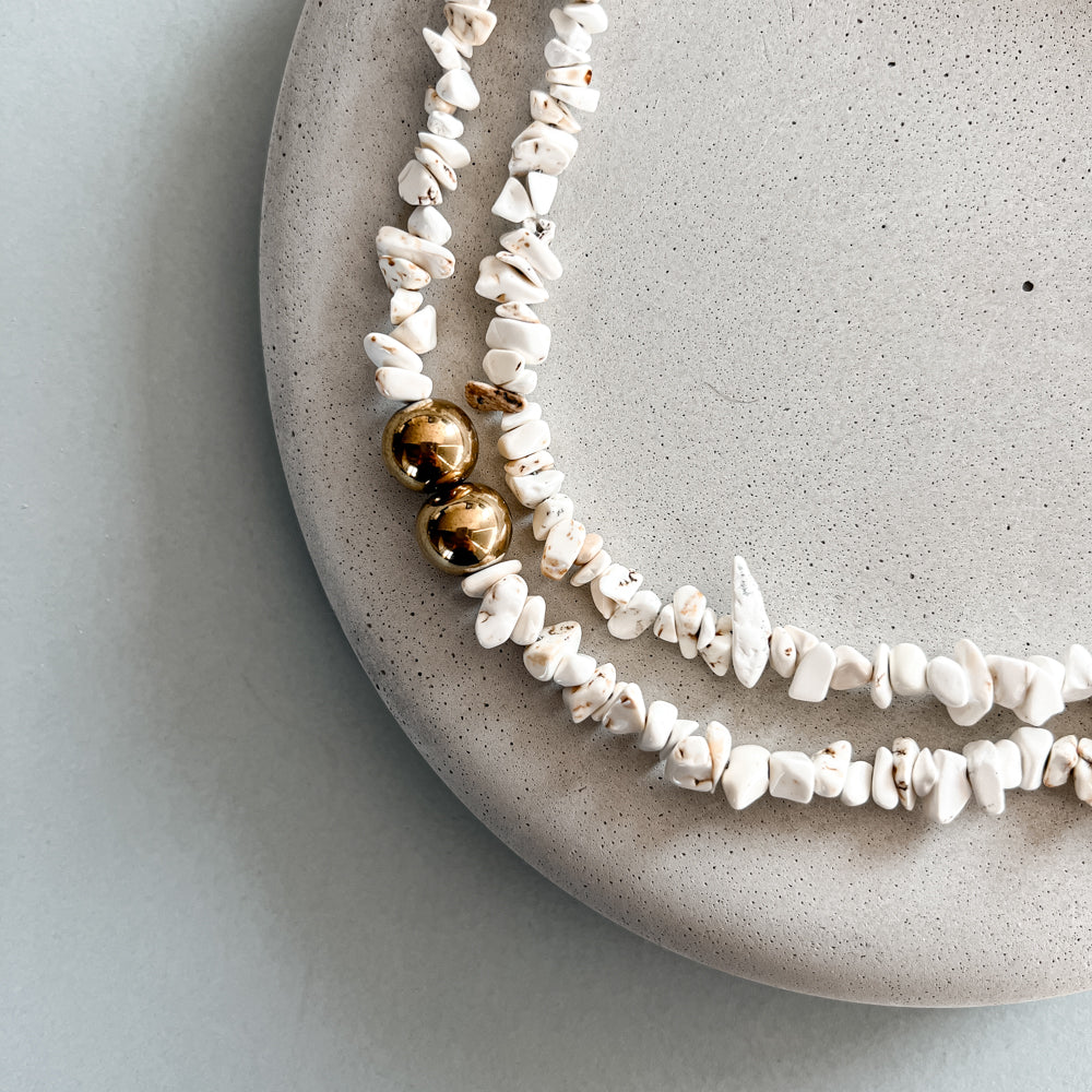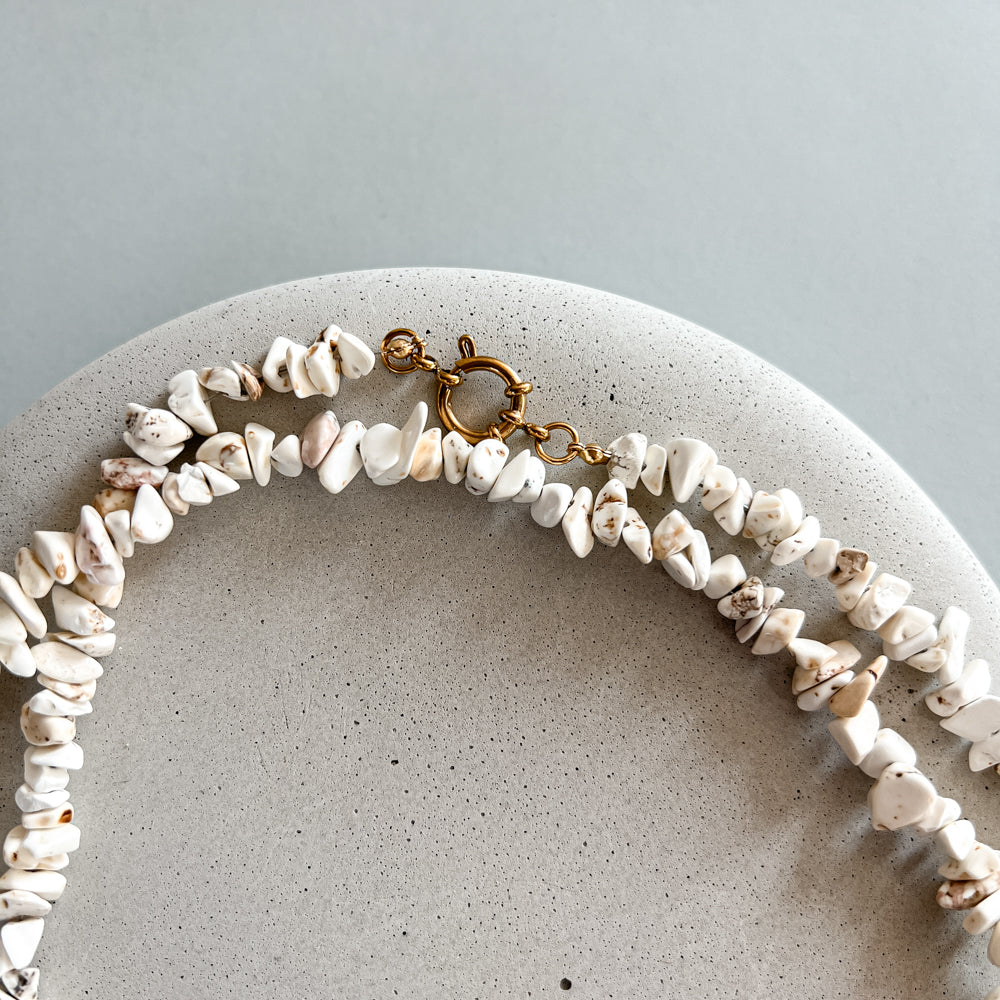 Ilgas kaklo vėrinys. Pagamintas iš natūralaus akmens magnezito, hematito ir nerūdijančio plieno. Ilgis – 89 cm.
