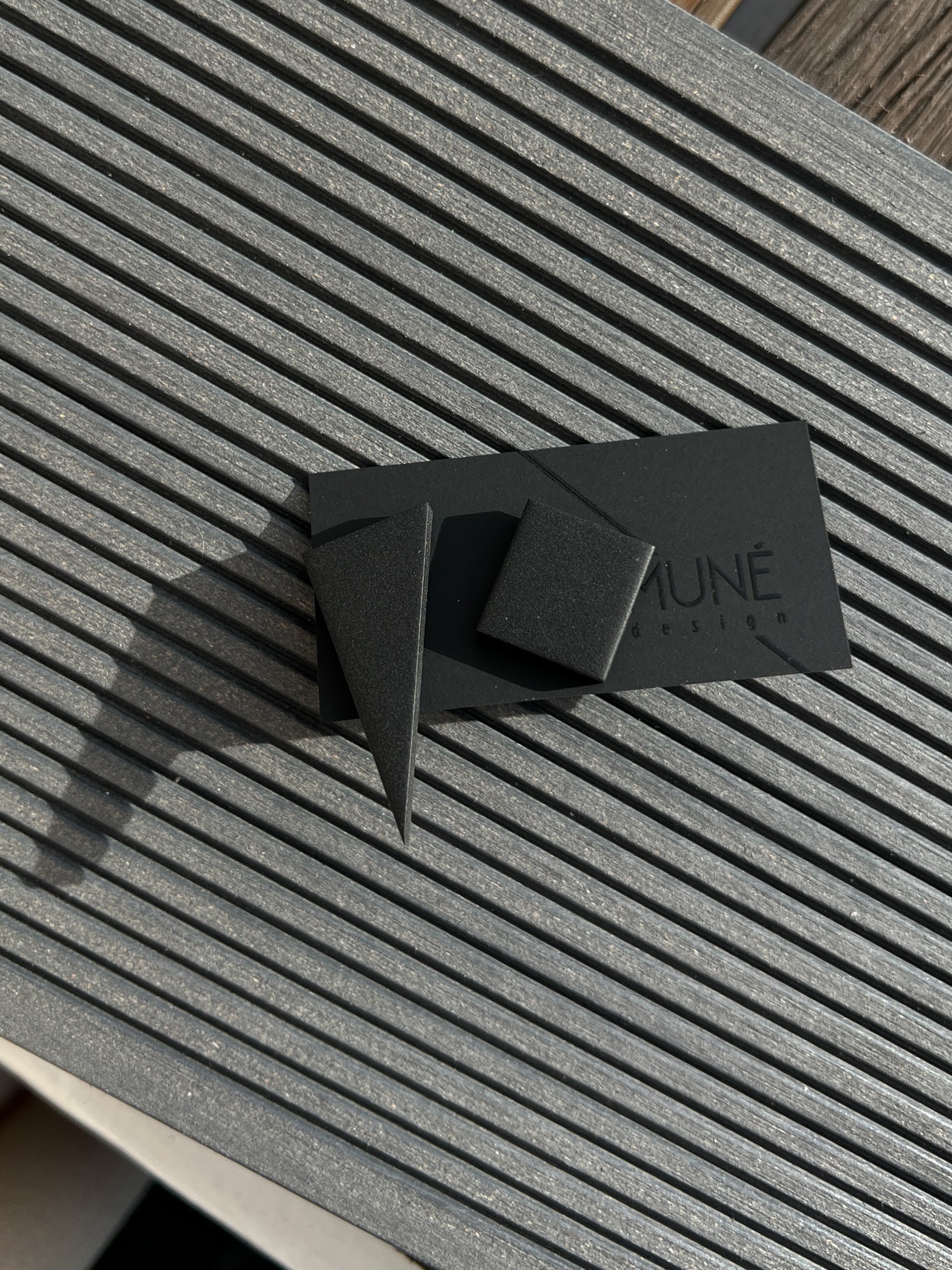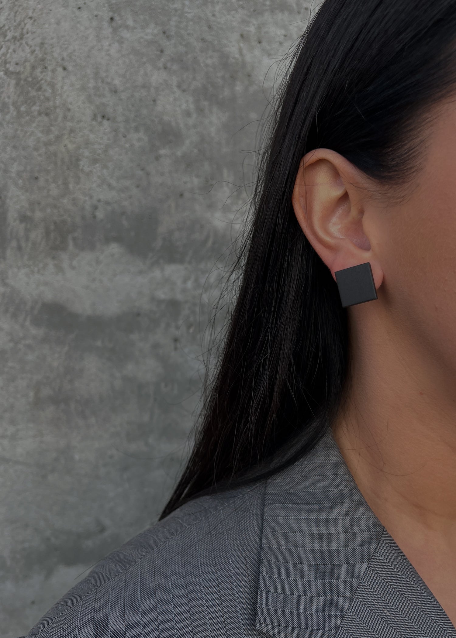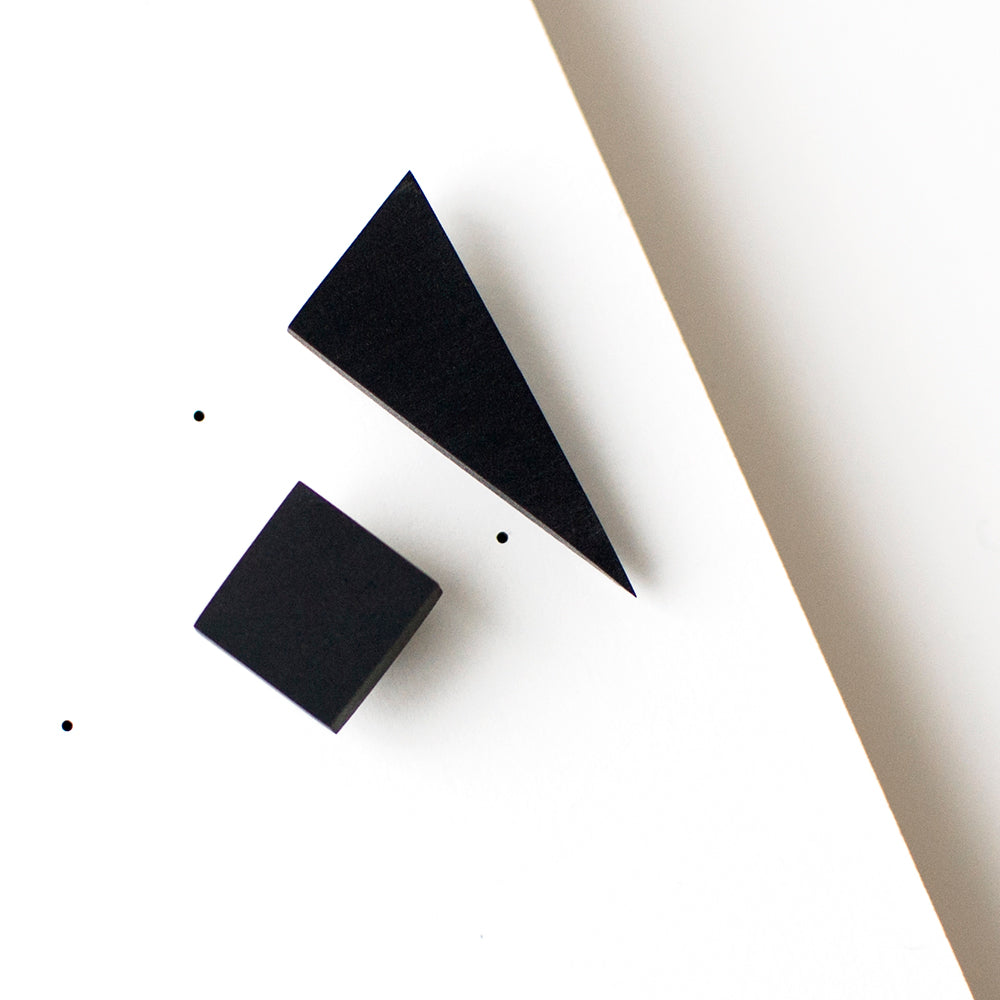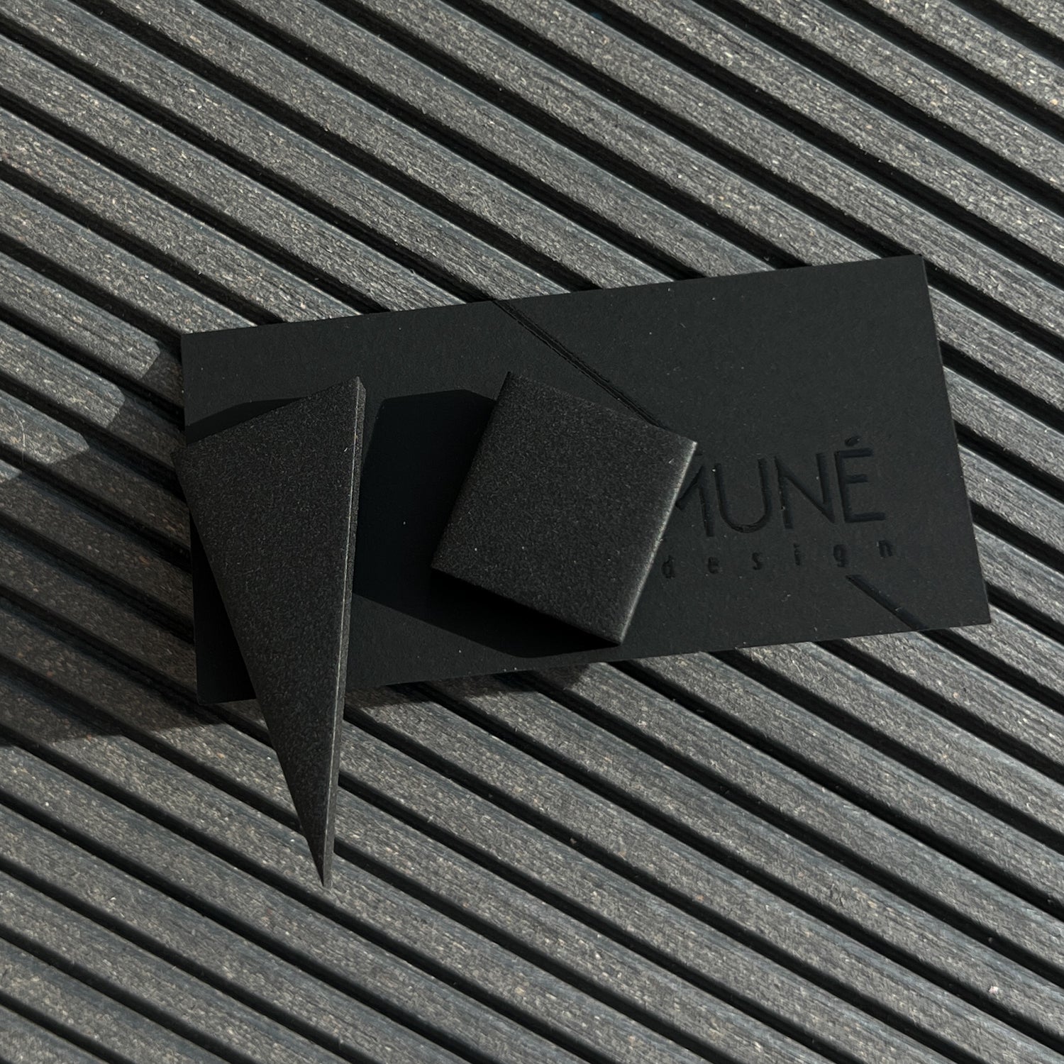 Geometriniai modernūs veriamieji auskarai. Itin lengvi. Medžiagos: polimerinis molis, nealergizuojantys, aukštos kokybės įvėrimai be nikelio. Matmenys: trikampis – apie 40 x 35 x 15 mm, kvadratas – apie 15 x 15 mm.