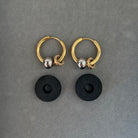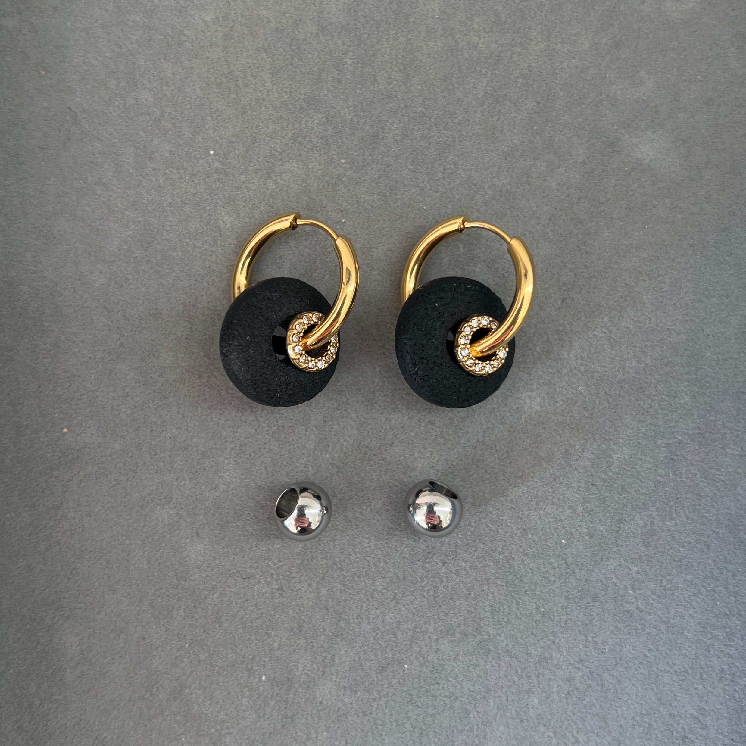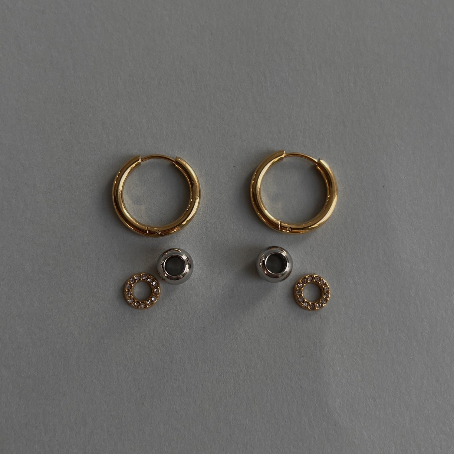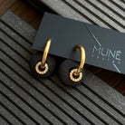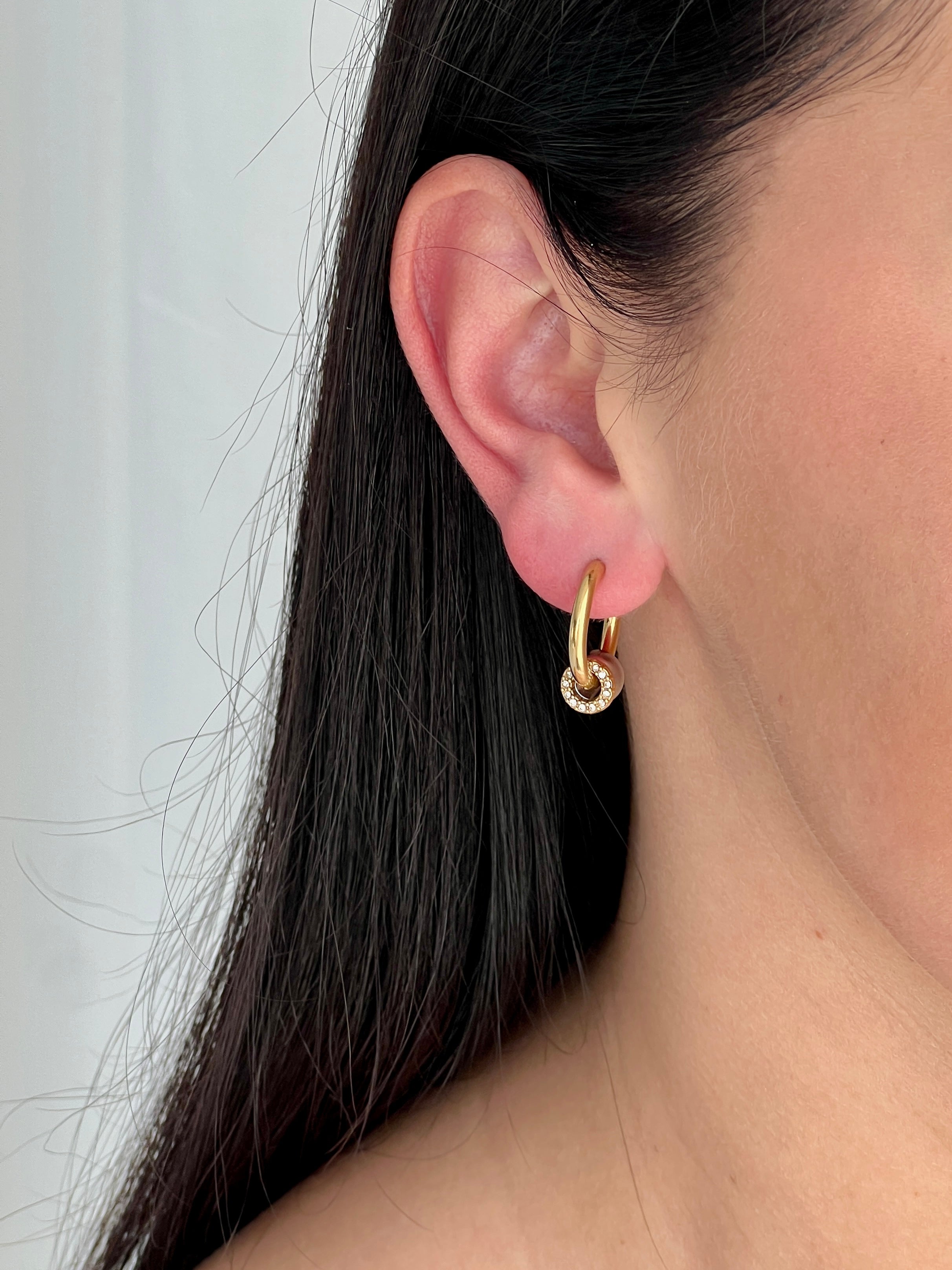 Auskarai-rinkutės su keičiamais pakabukais. Vienas pakabukas su cirkoniais. Pagaminti iš nerūdijančio plieno, padengti 1,5 mikrono PVD auksu, o tai reiškia, kad paauksavimas išlieka ilgiau bei yra atsparus vandeniui.