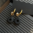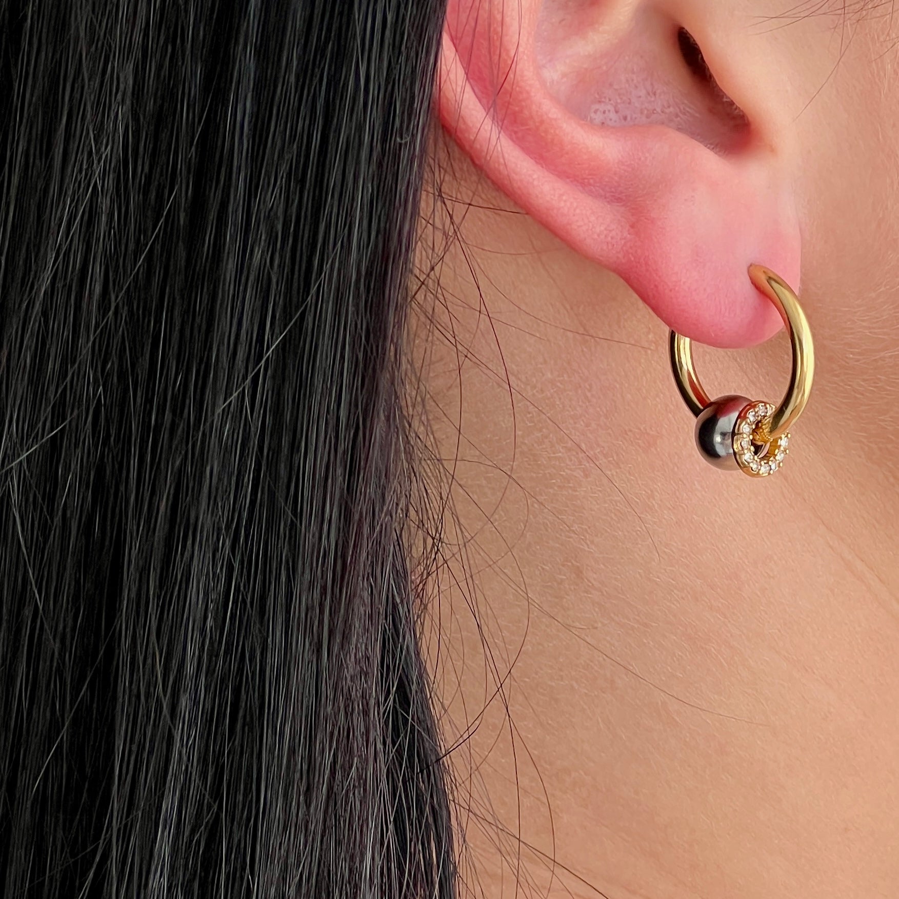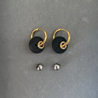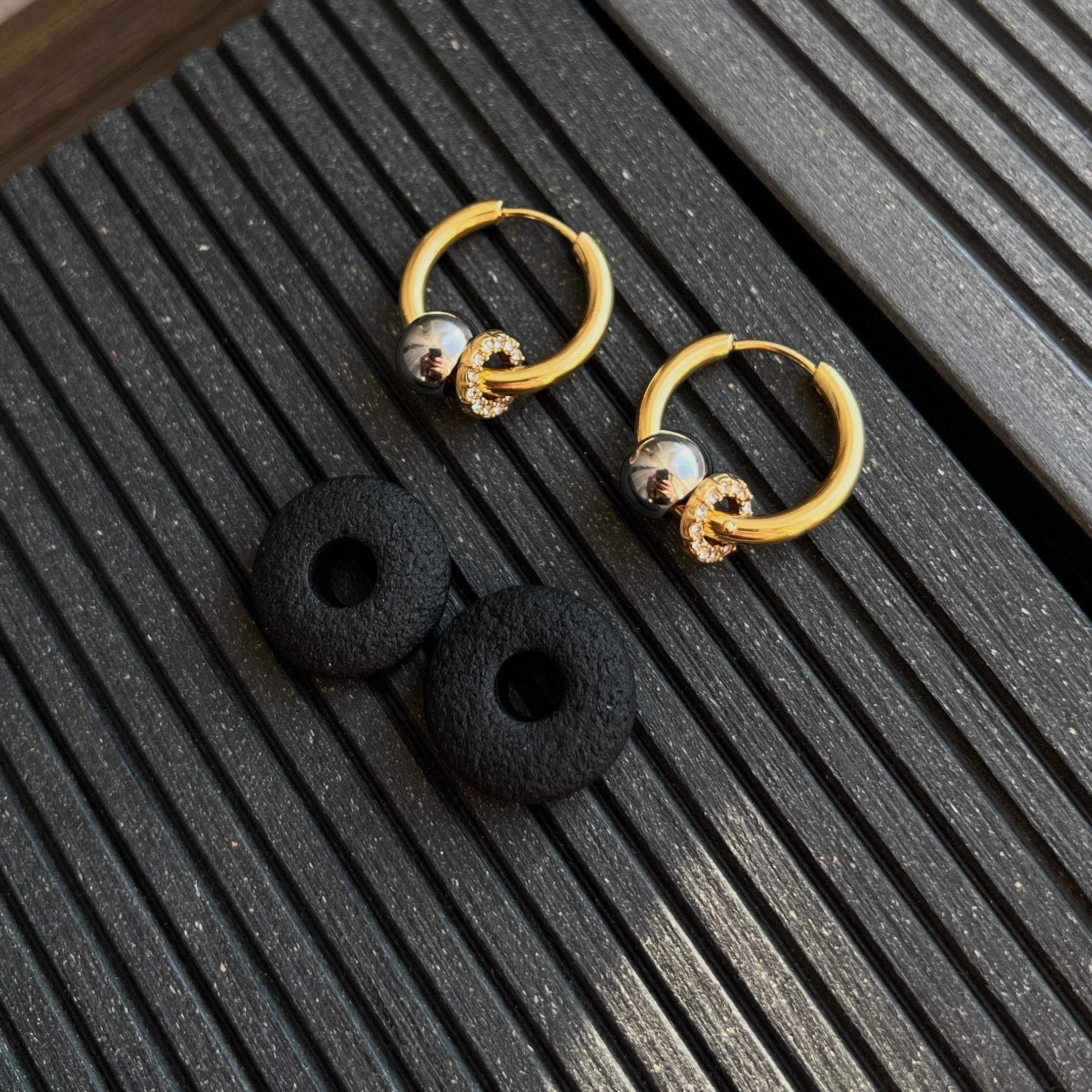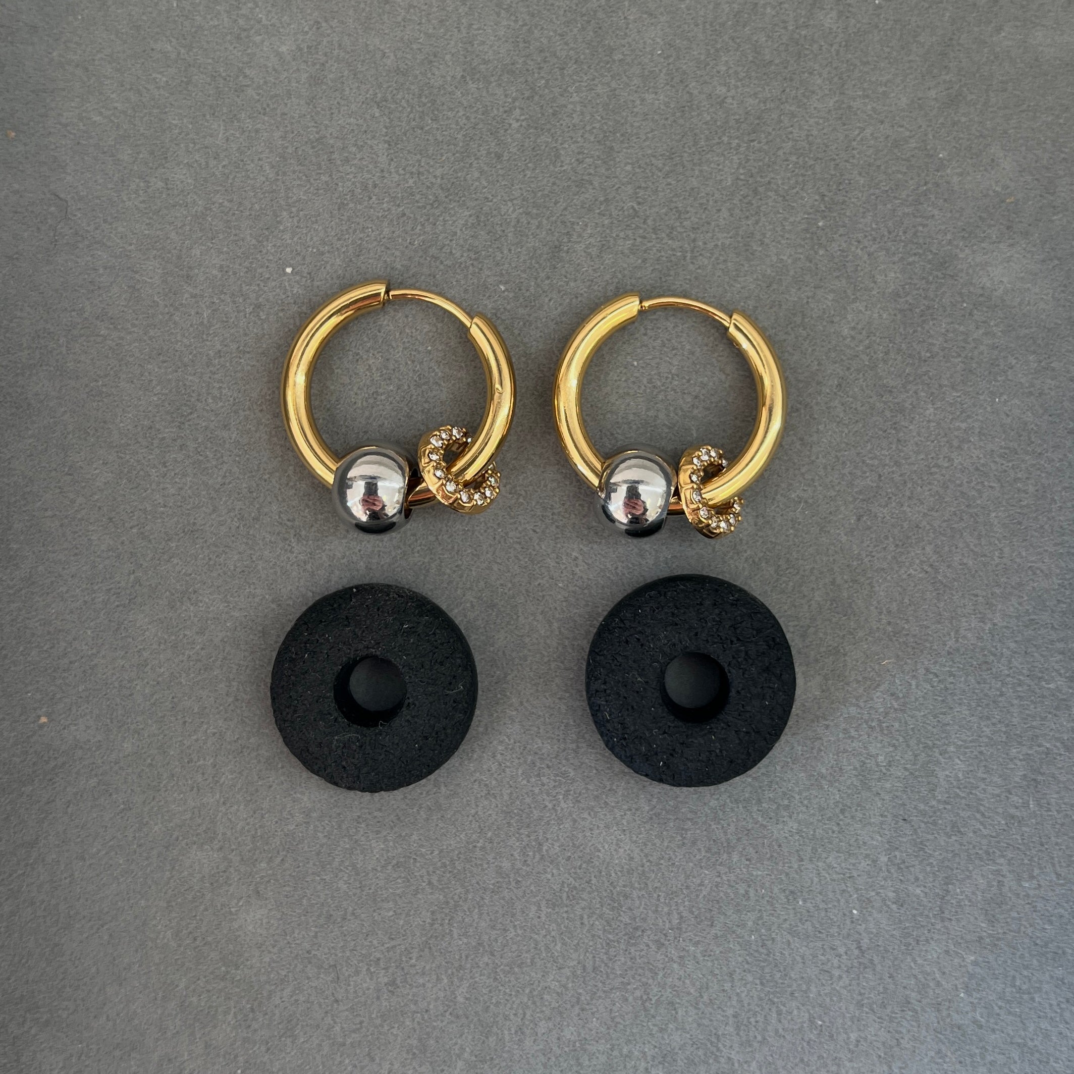 Auskarai-rinkutės su keičiamais pakabukais. Vienas pakabukas su cirkoniais. Pagaminti iš nerūdijančio plieno, padengti 1,5 mikrono PVD auksu, o tai reiškia, kad paauksavimas išlieka ilgiau bei yra atsparus vandeniui.