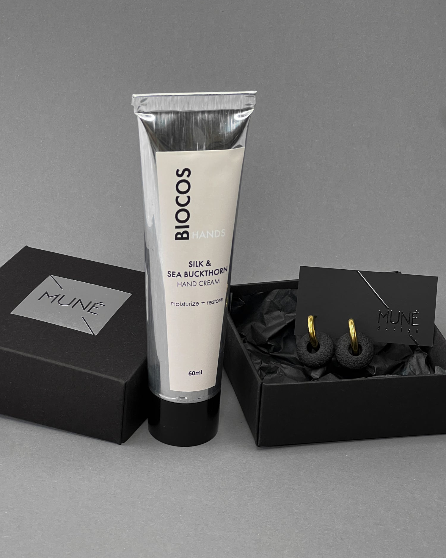 Rinkinys: natūralus rankų kremas ir paauksuoti auskarai hoops_black